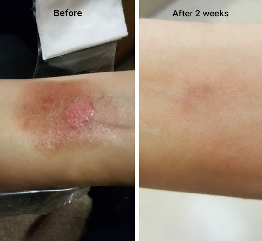 Female patient with a burn on the forearm caused by steam from a pressure cooker. To quickly (around 5 min) & effectively relieve pain & stop sensations. CamOleum Plus 3 in 1 for Burns, Wounds and Skin Irritation & Itching was immediately applied. Patient continued to apply CamOleum four times daily for 2 weeks.